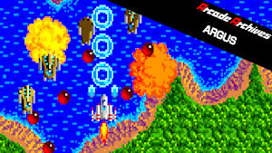 “ARGUS” is a shooting game released by JALECO in 1986. Fly an aircraft with anti-air and anti-ground guns and use the power-ups available to destroy the flying fortress Mega Argus. Each stage features different equipment and a landing sequence at the end of the stage.