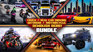 Experience the ultimate driving and vehicle simulation with the Truck / Real Car Driving / Offroad / Motorcycle / Demolish Derby Bundle! This collection includes five thrilling games, each offering unique driving challenges, stunning environments, and realistic mechanics. Whether you’re delivering cargo, racing through city streets, conquering offroad terrain, riding high-speed motorcycles, or wrecking cars in demolition derbies, this bundle has it all!
